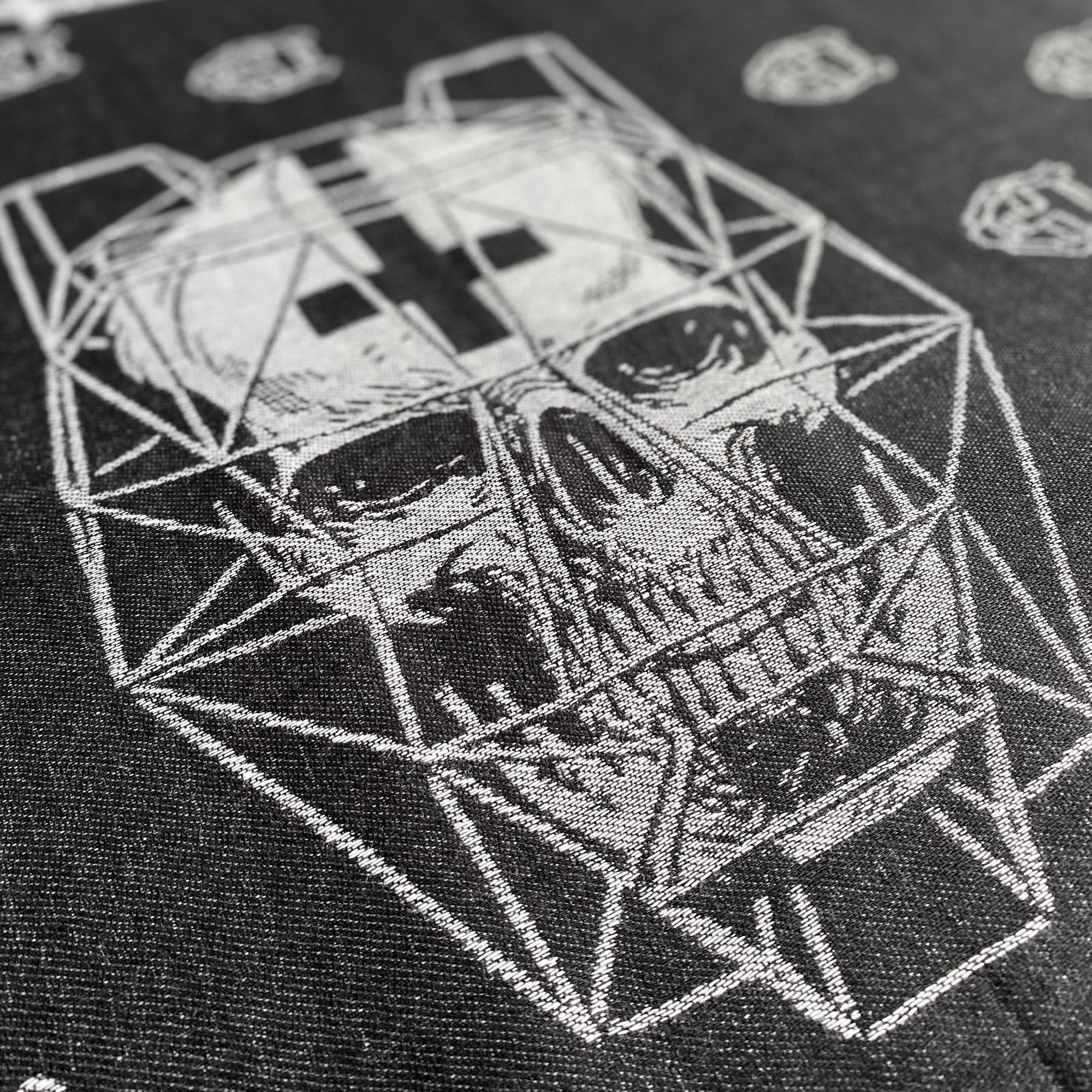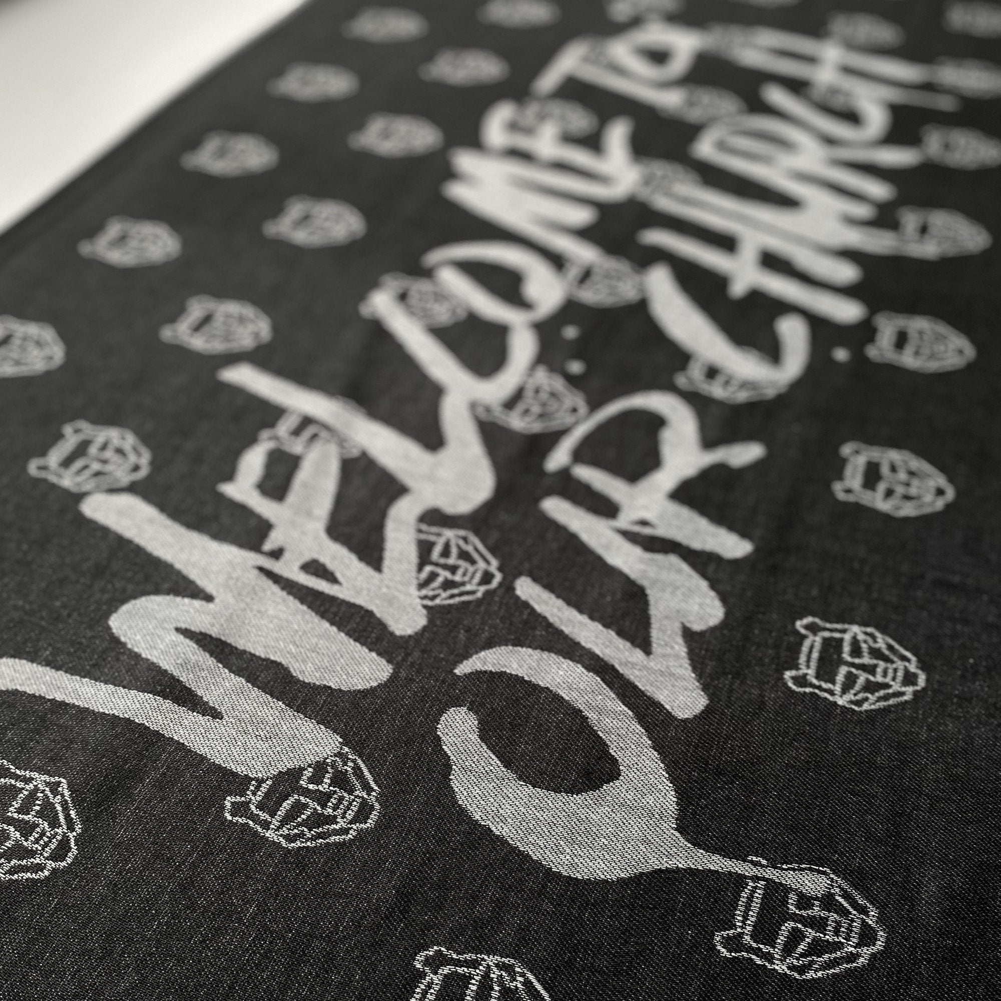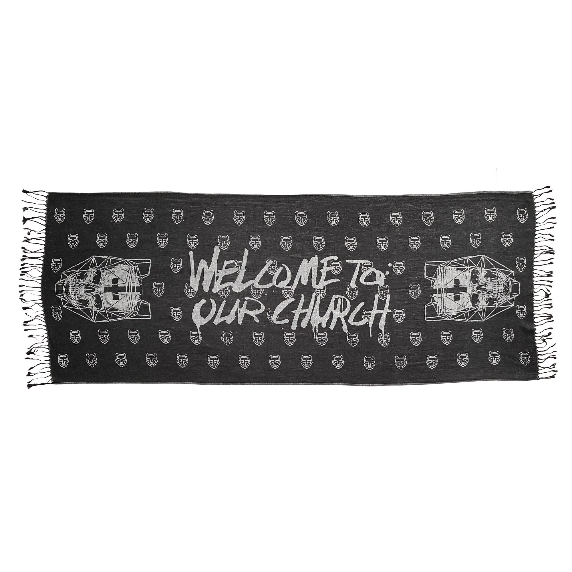Custom knit pashmina with BTSM helmet and Welcome to Our Church designs.