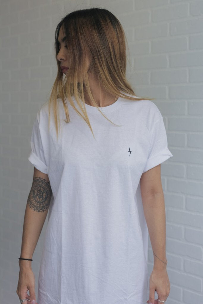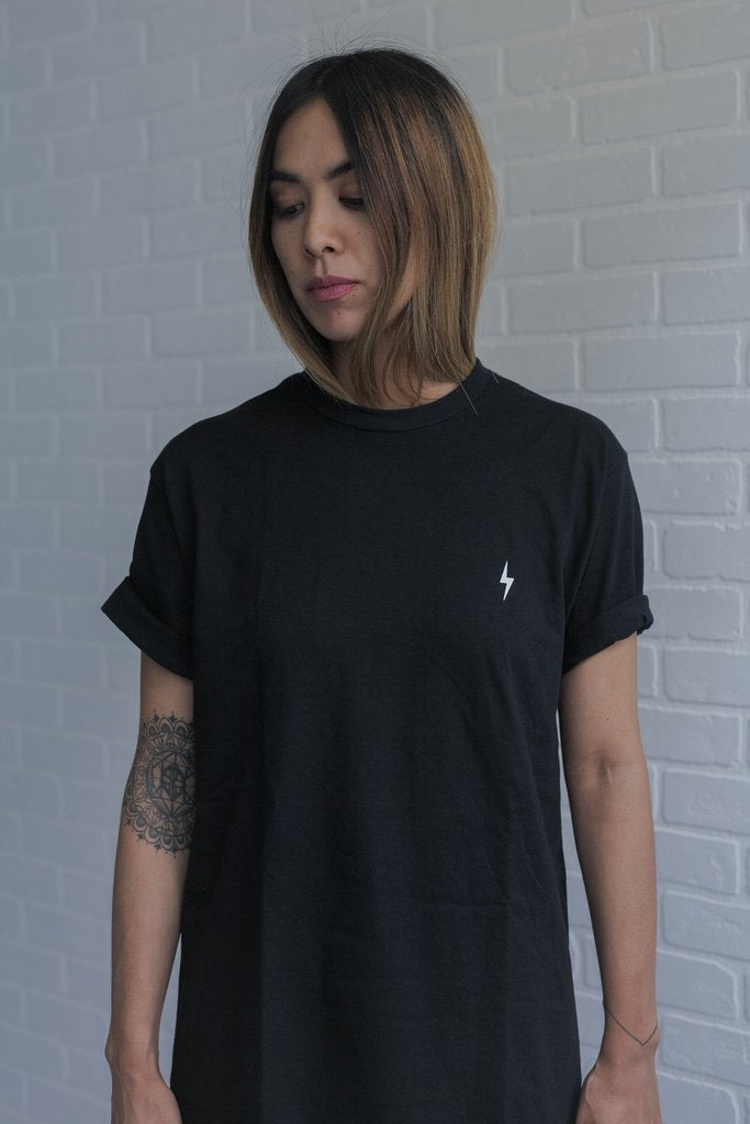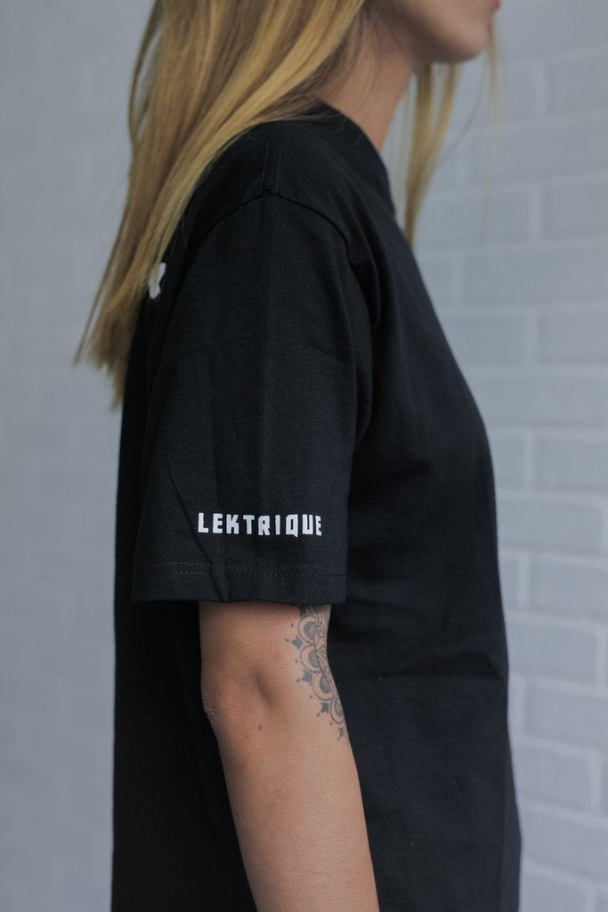 Lektrique thunderbolt on front, Lektrique logo on  the right sleeve and Kannibalen Radio logo on back.