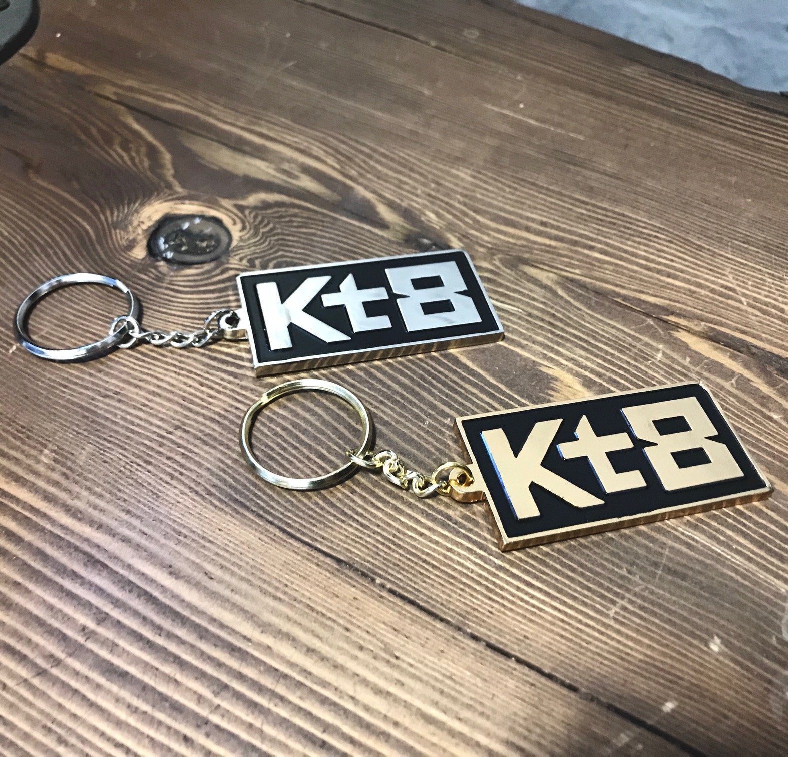 KT8 Create + Deploy key chains. Heavy, stamped alloy metal. Measure 2.5x1.25". Available in silver or gold.