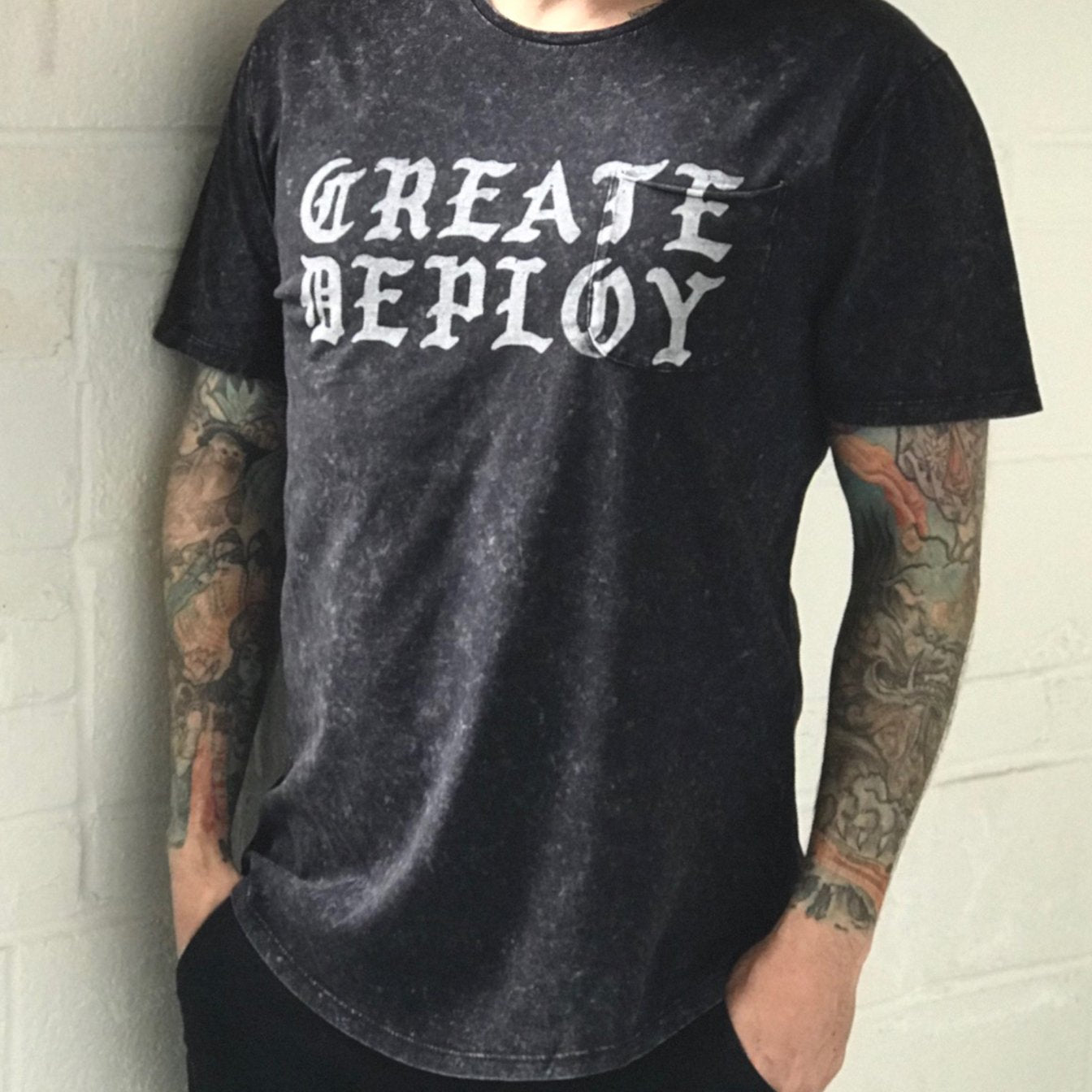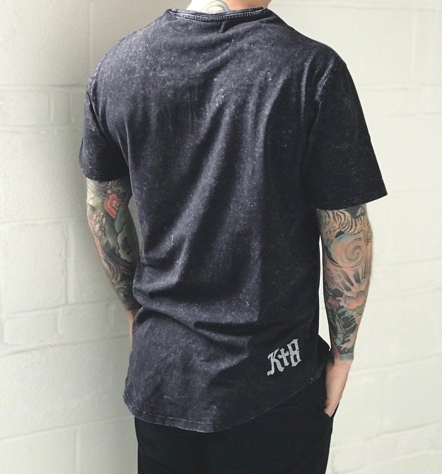 KT8 "Create + Deploy" pocket tees. Vintage stone wash. Front Pocket. Long, tailored fit. Front and back prints.