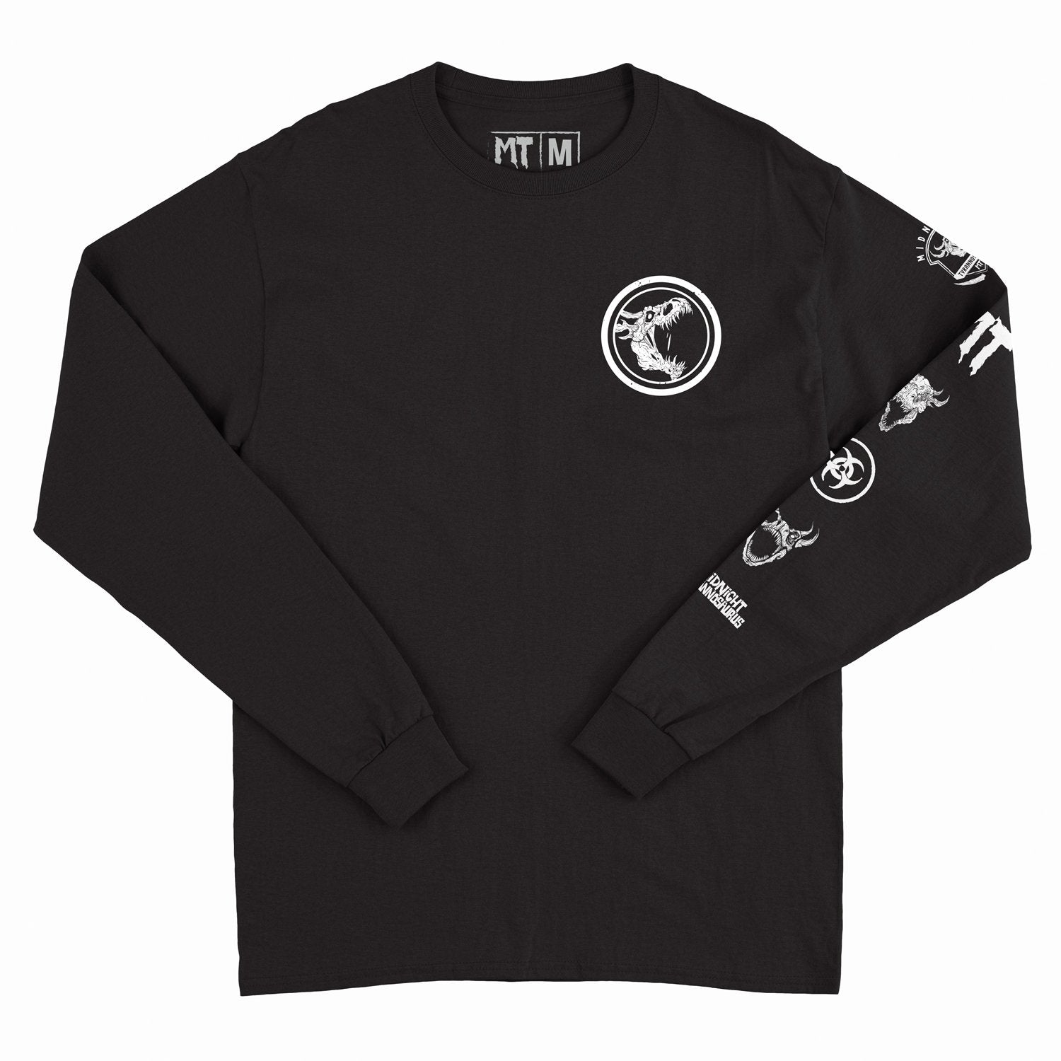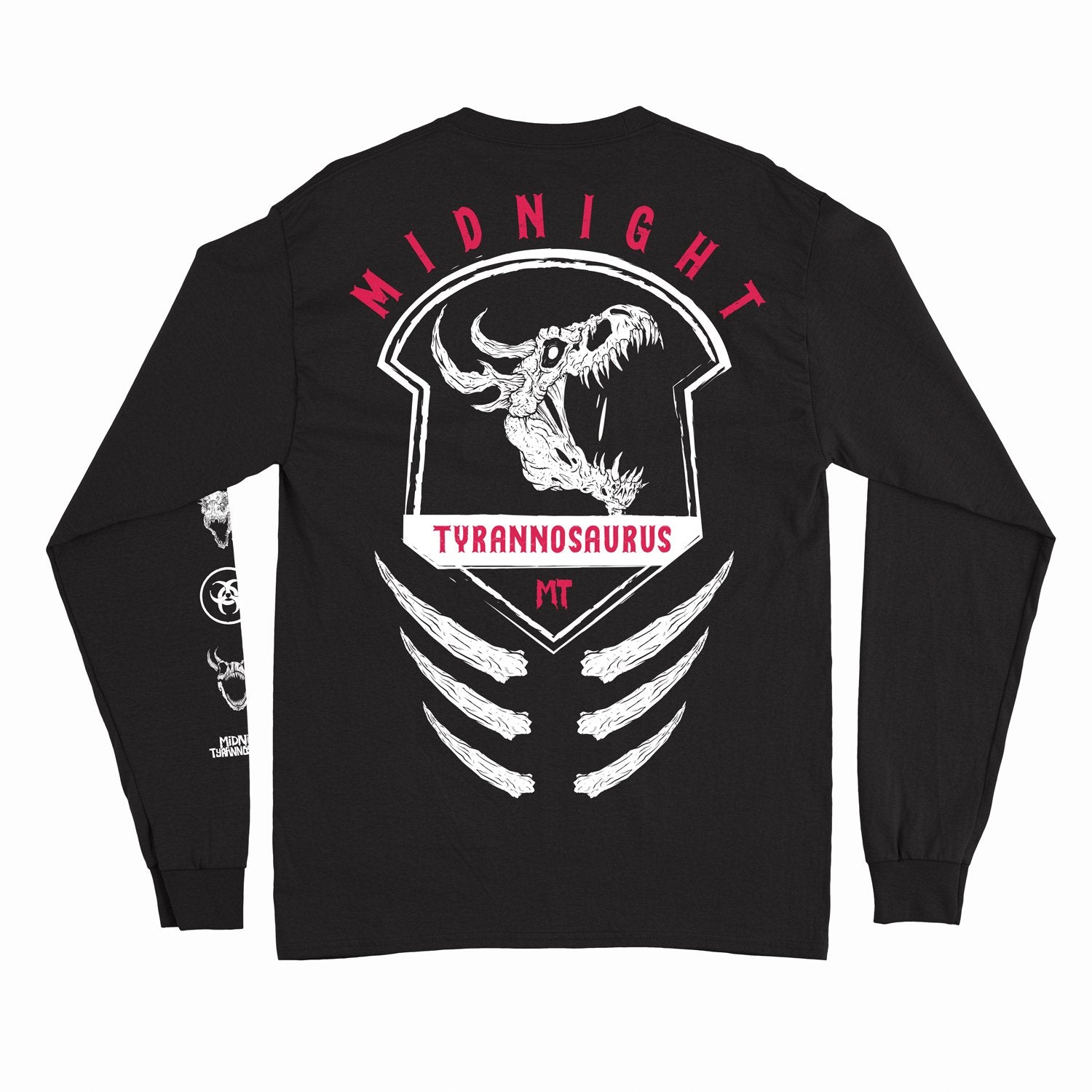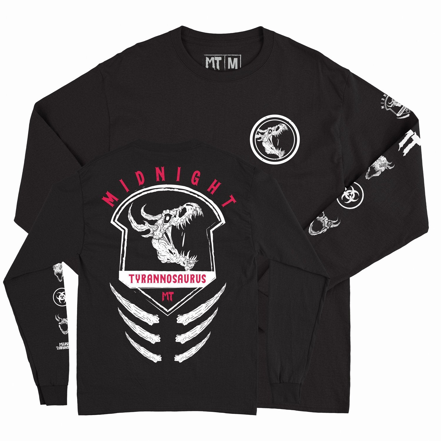 Midnight Tyrannosaurus 'Zombie Rex Long Sleeve Tees. Front, back and side arm prints on a premium, fine jersey cotton unisex shirt.