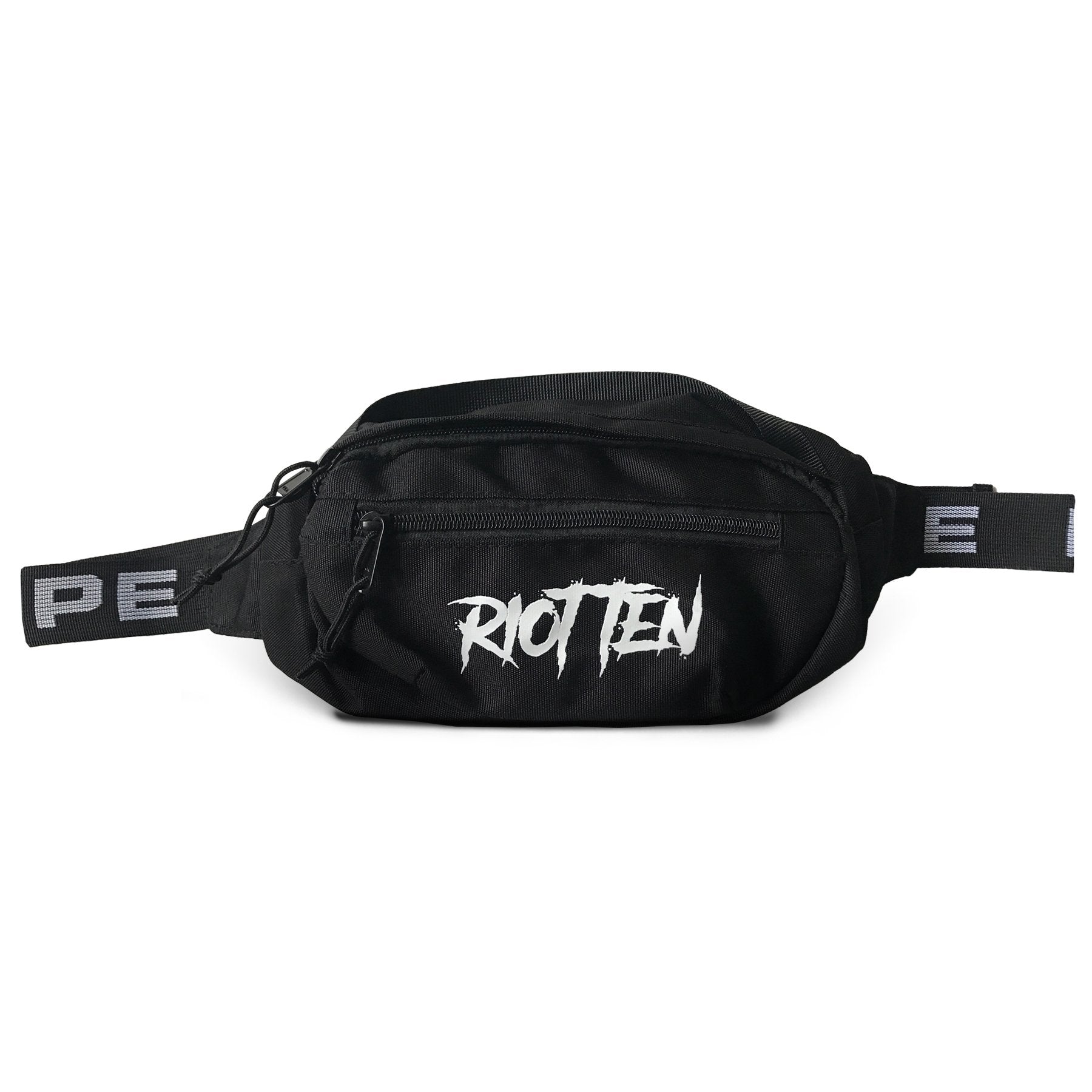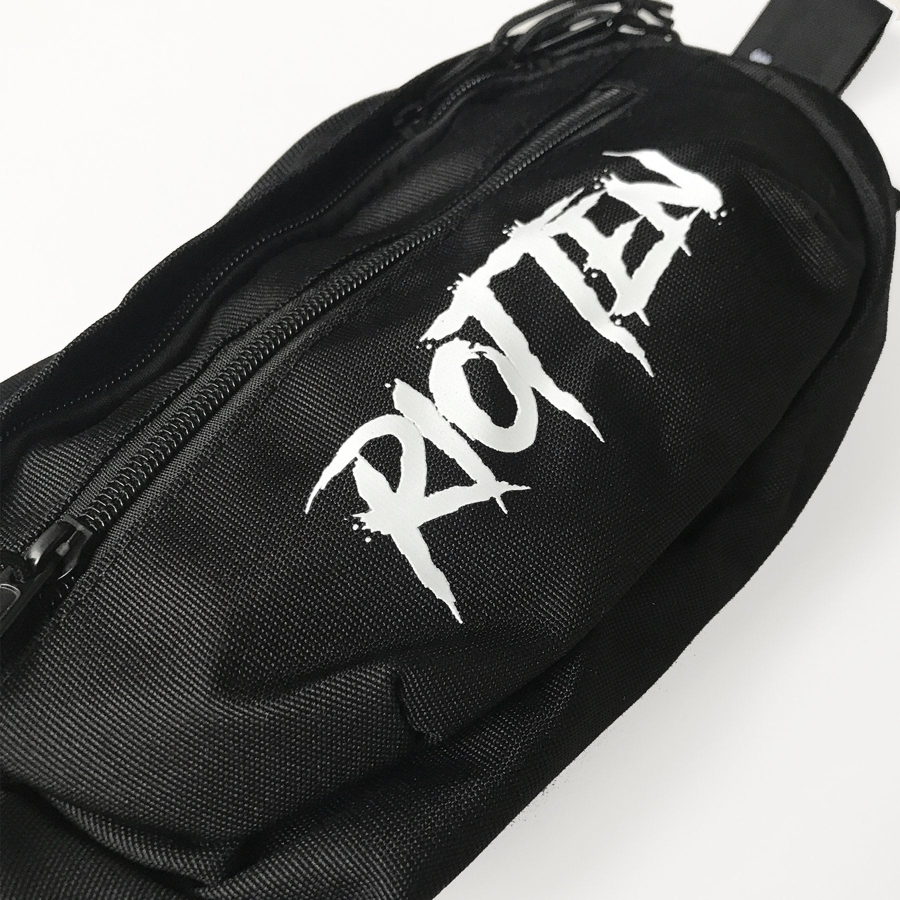 Riot Ten custom Fanny Packs feature 2 individual zippered compartments, adjustable strap, and front logo. Rugged construction, with a padded back panel. Measures approximately 11.5" x 6.5".