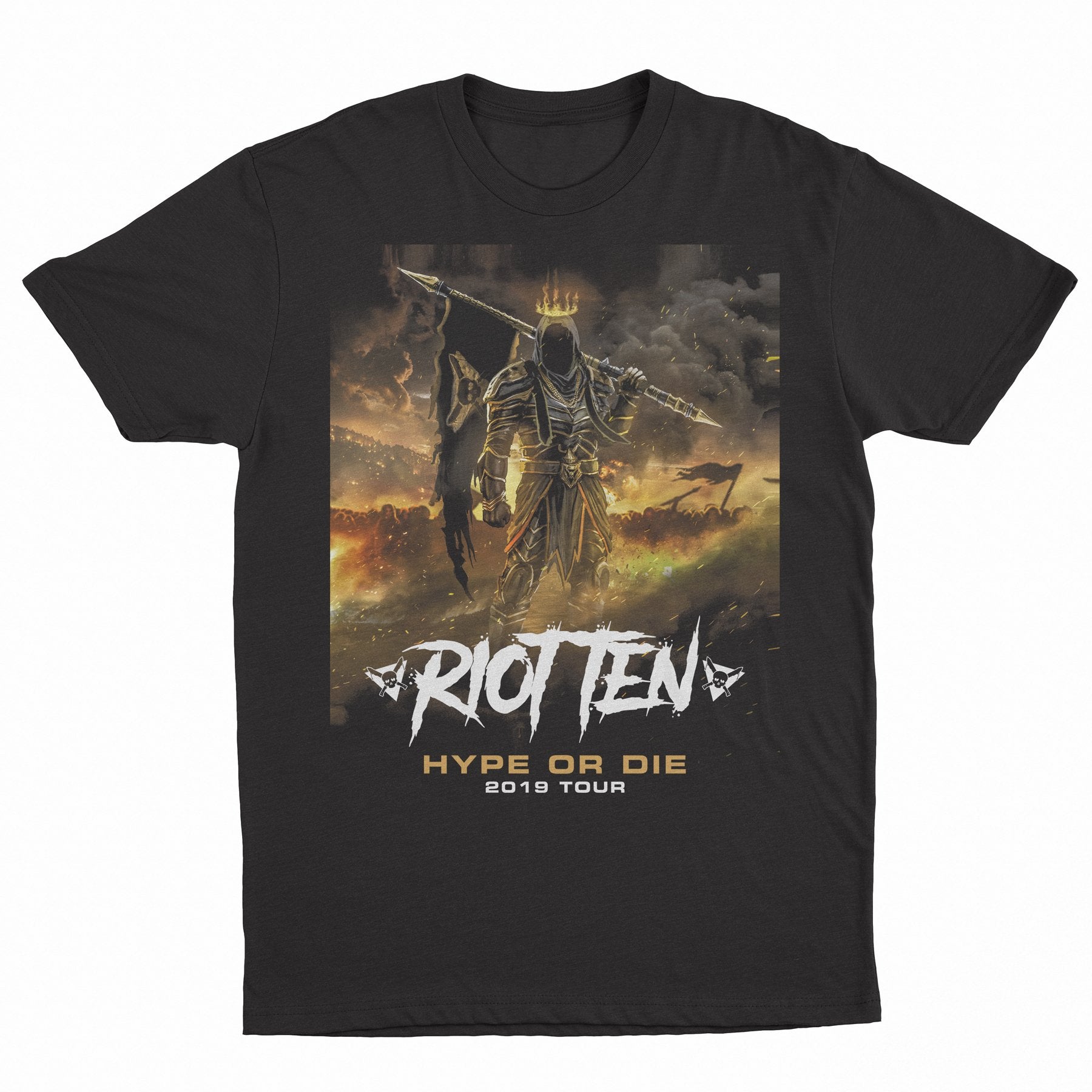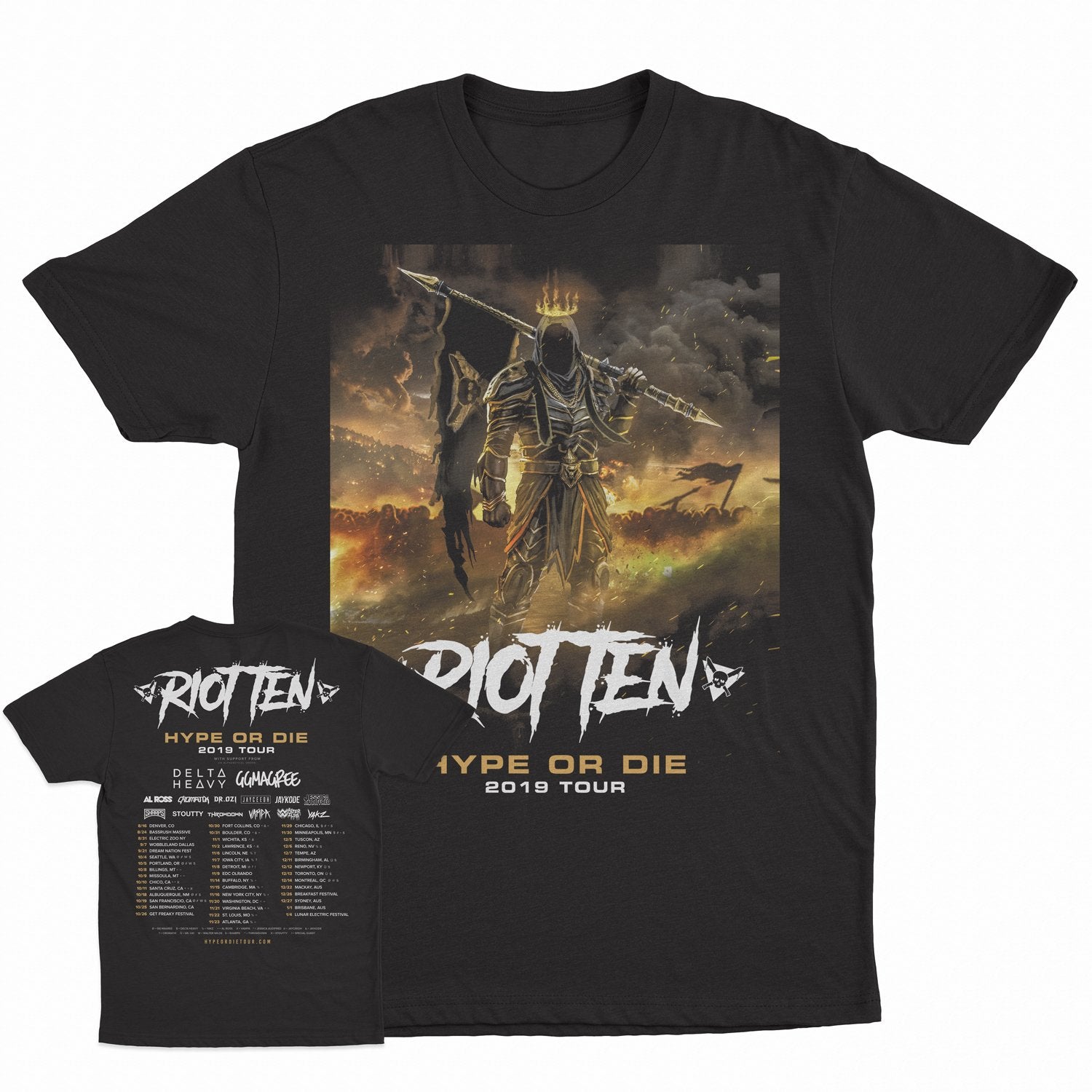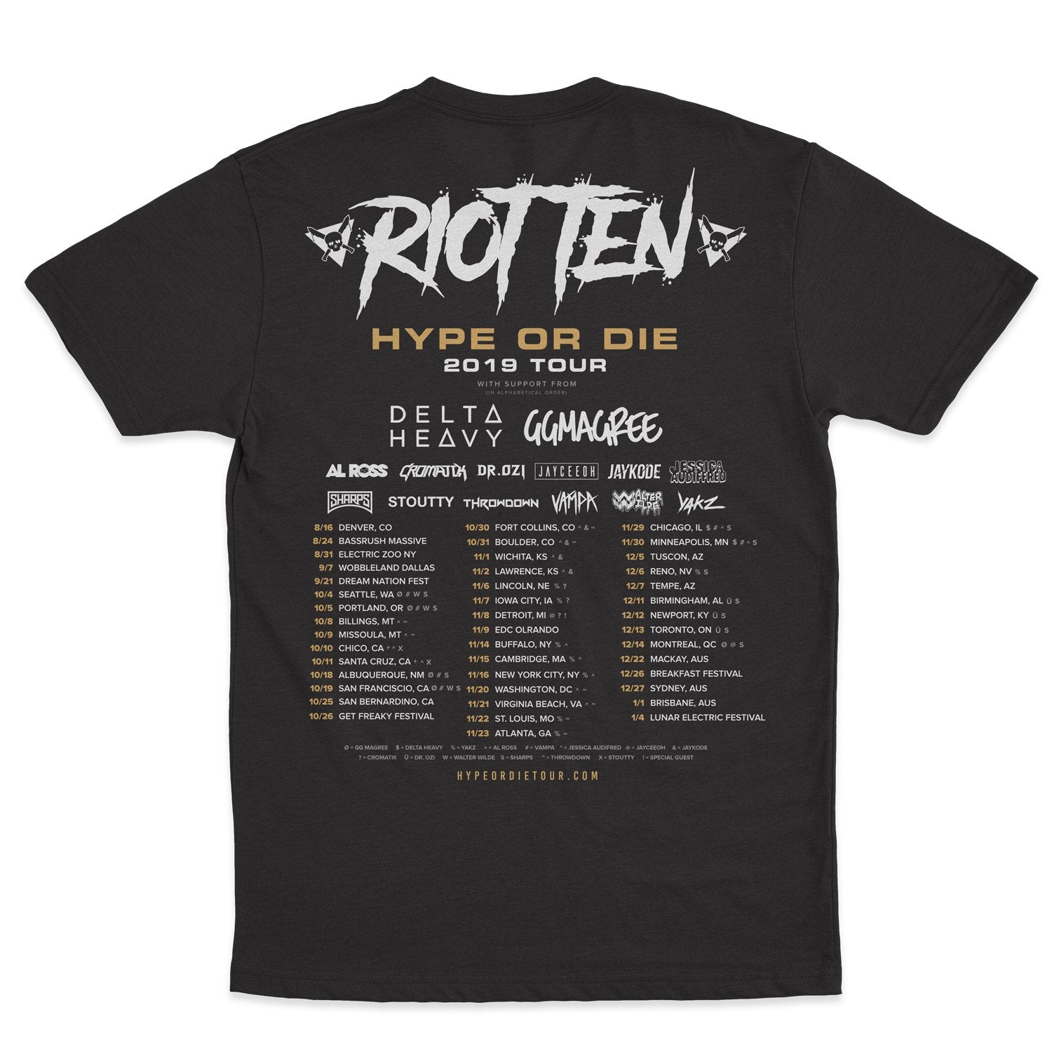 Riot Ten 'Hype Or Die' official tour t-shirts. Front and back print on a premium, soft cotton shirt.