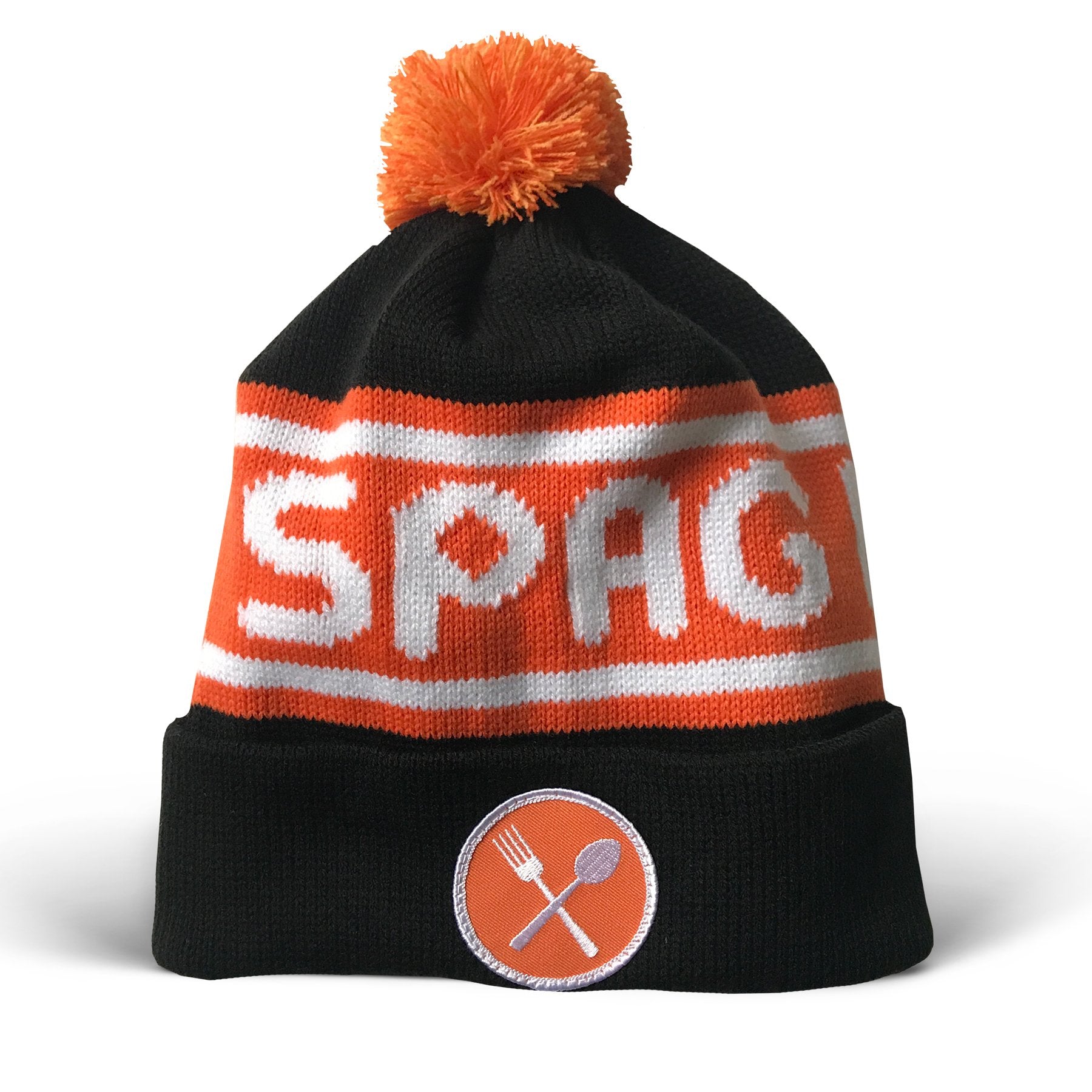 This one of a kind custom knit hat is 100% high bulk acrylic, 3 colour, 2 ply with a cuff & 3 inch pom pom. Features a "Spag Heddy" logo woven into the toque, and front patch. Made in Canada.