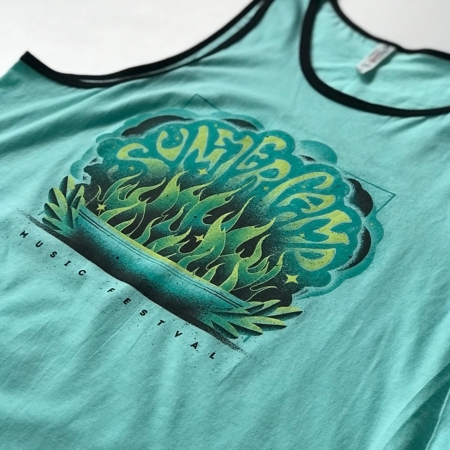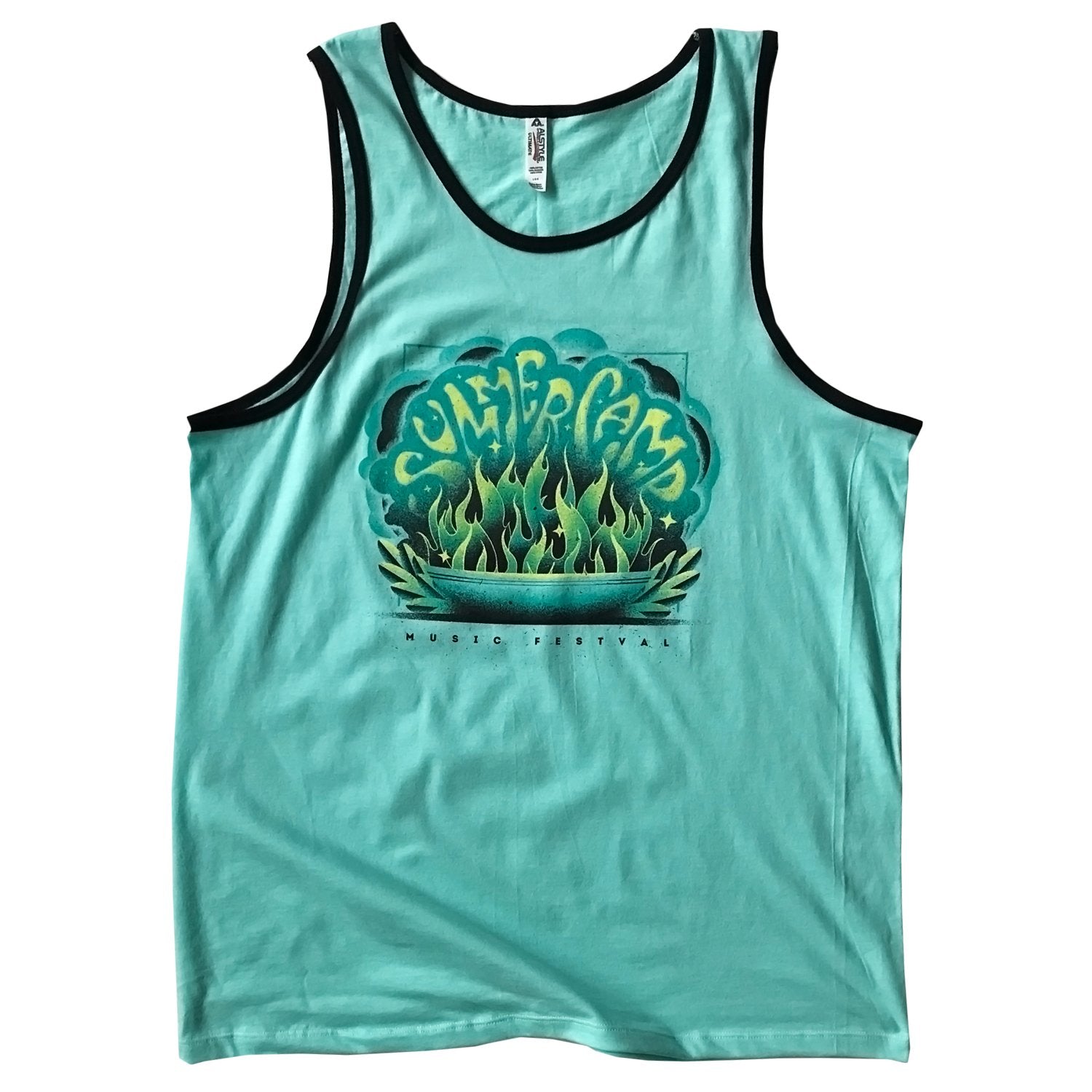 Summer Camp 2019 Music Festival "SCampFire" tank tops are printed on premium, soft cotton, loose fitting unisex tanks and feature a front print. Celadon color with black trim.